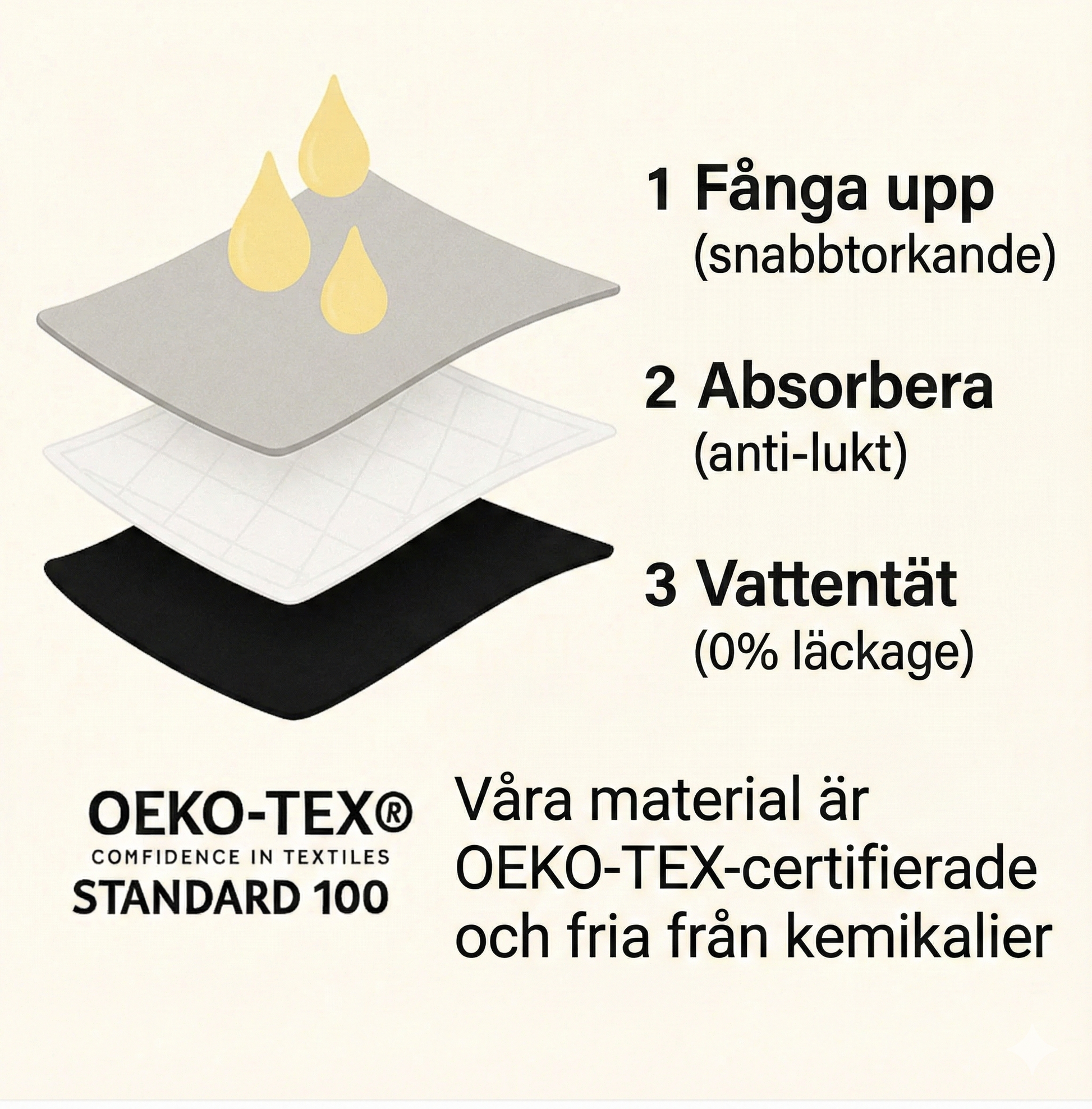 3. Lager 3 – Vattentät: En säker barriär som garanterar 0% läckage mot dina kläder.