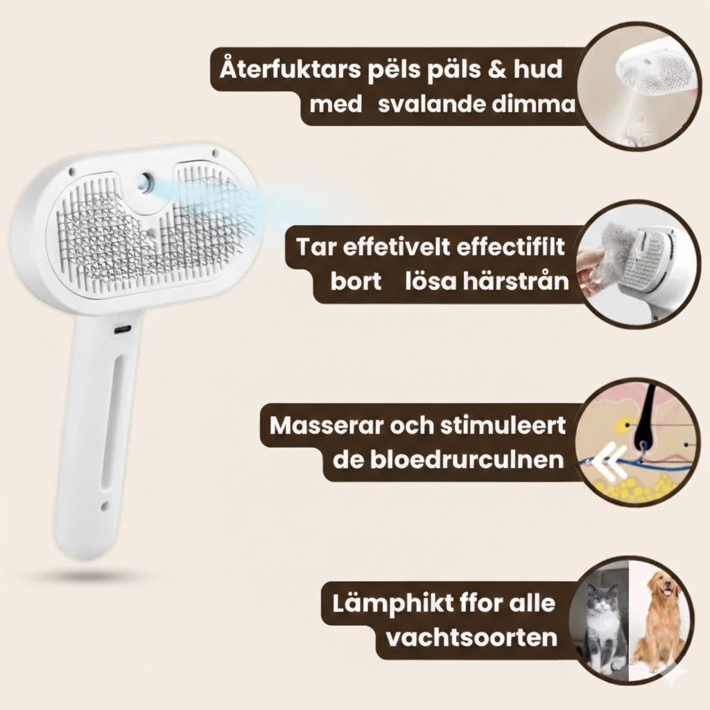 Pflegen Sie Ihr Haustier wie ein Profi mit PälsDimma Steami Pro – unserer innovativen Bürste, die lose Haare, Verfilzungen und Schmutz mühelos entfernt, während das Fell mit Feuchtigkeit versorgt bleibt.